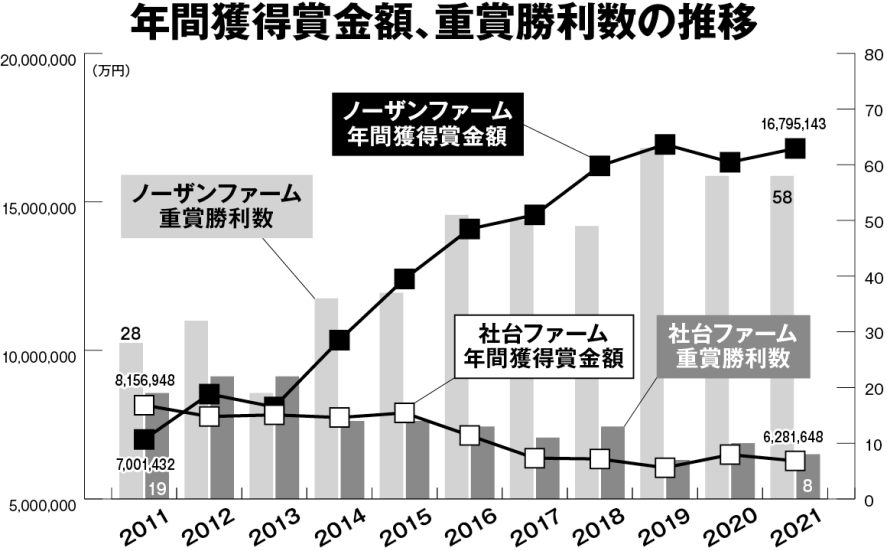 【競馬】社台ファームを獲得賞金額で突き放すノーザンファーム 財界さっぽろ編集部 2022年09月01日 23:14 2022年9月号 有料記事 Tweet いまから2年前、コントレイルとデアリングタクトが、無敗の3冠馬となった。同じ年に牡馬、牝馬による偉業はJRA史上初めてのこと。一度も土がつかないだけでもすごいことだが、どちらも日高の生産馬だったことに、競馬ファンは夢をはせた。 背景には、日本の競馬界が社台グループの独壇場と呼ばれるところに帰結する。GⅠなどの大レースは〝社台の運動会〟と言われることもある。... (残り986文字)