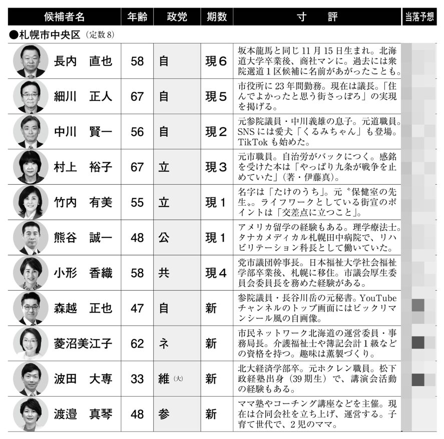 【札幌市議選:中央区】 財界さっぽろ編集部 2023年03月31日 17:30 2023年4月号 有料記事 Tweet ©財界さっぽろ 議席が1つ増え、定数8となる中央区。自民現職・長内直也、細川正人、中川賢一の3人は盤石だ。地盤についても長内は桑園エリア、細川は幌西エリア、中川は山鼻・曙エリアと、すみ分けている。 自民候補では前回出馬した森越正也が再挑戦。無所属新人(自民推薦)で戦った前回は大敗を喫したが、今回は定数1増となったこともあり、公認候補に格上げされた。 自民勢が警戒するのが、... (残り538文字)