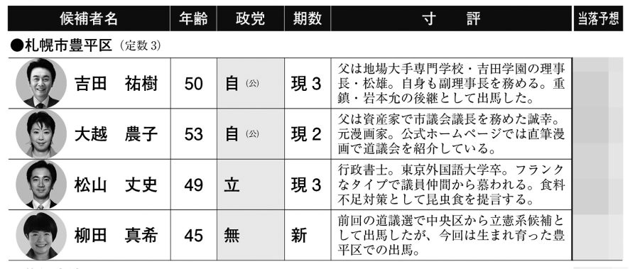 【道議選:札幌市豊平区・清田区・南区・西区・手稲区】 財界さっぽろ編集部 2023年03月31日 17:30 2023年4月号 有料記事 Tweet ©財界さっぽろ 札幌市豊平区 3月下旬まで現職3人のみ立候補を表明していたが、告示日直前に柳田真希が出馬を決意。無投票は回避された。柳田は前回は立憲系候補として戦ったが、今回は無所属。直前の出馬表明ということもあり、柳田が現職の壁を崩すのは難しい。 札幌市清田区 立憲の現職・梶谷大志は前衆院議員・荒井聰の元秘書。現在は立憲道連の幹事長という重責を担う。... (残り1623文字)