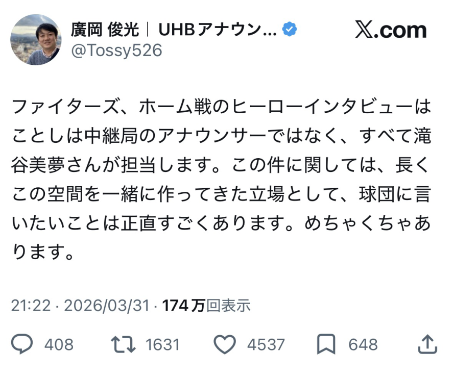 3月31日に本拠地開幕戦を迎えたファイターズは、期待の若手がノーヒットノーラン達成、主力にも長打が飛び出して快勝。だがその後のヒーローインタビューと聞き手を担当したタレントをめぐり、中継を担当した道内テレビ局のアナウンサーがXに投稿した内容が物議を醸し、のちに削除、謝罪する事態となった。何が原因だったのか。